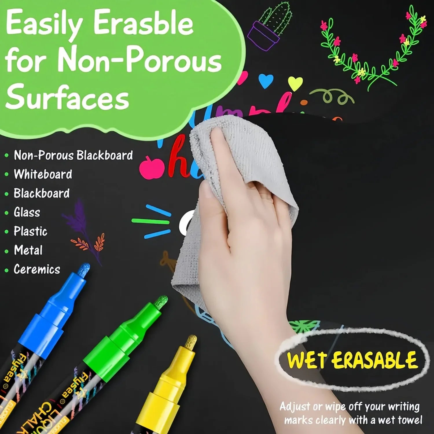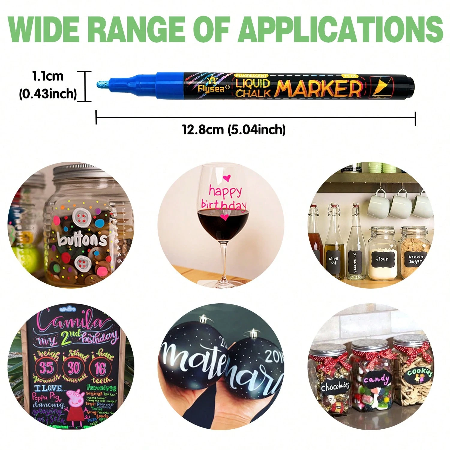 Colorful & Erasable - Our whiteboard markers feature vibrant colors that stay bright and vivid.Easily wipe away your liquid chalk markers with a damp paper towel, leaving no residue on non-porous surfaces like windows, glass, or blackboards. Ideal for work that needs frequent updating like calendar board, bistro signs - these quick-erase wipeable chalk pen make changes easy.