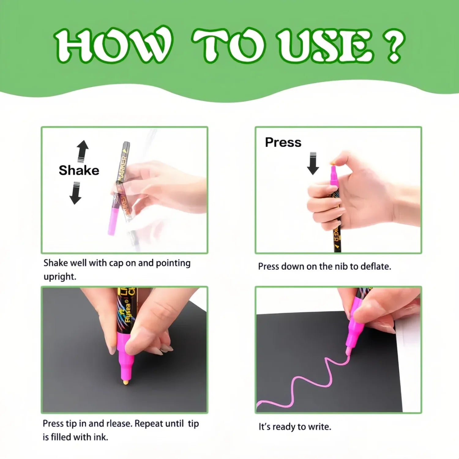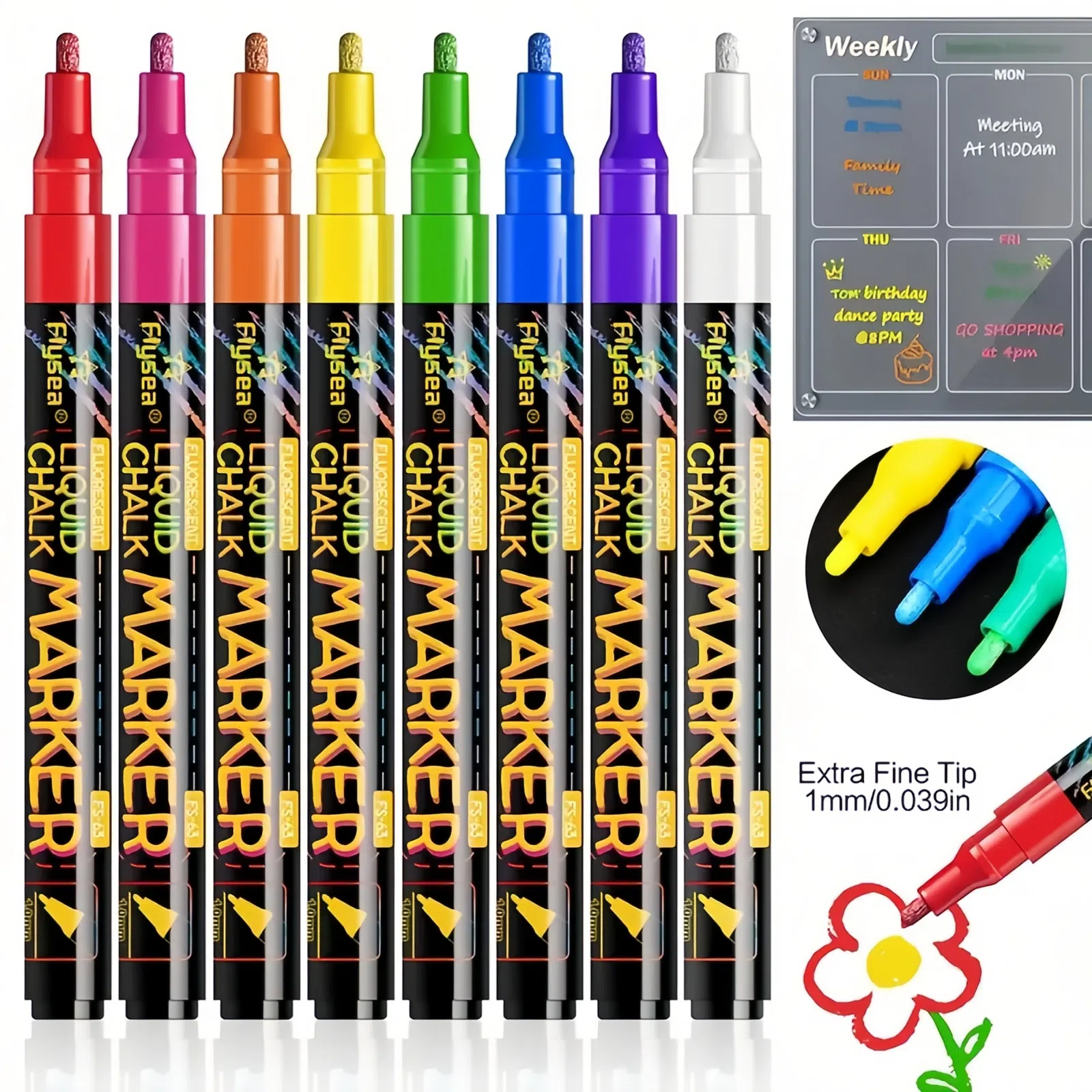 8 Extra Fine Liquid Chalk Markers Erasable - 8 bold and vibrant neon chalk paint markers (1mm extra fine point). Upgrade from traditional dusty chalk with vibrant neon chalk markers for chalkboards, windows, or glass surfaces.These thin tip chalk board marker pens give you smooth-flowing writing.